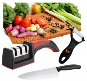 🥇 Combo 3 en 1: Afilador + Cuchillo Acero + Pelador Cerámico